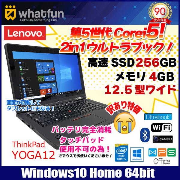 【中古パソコン】Lenovo THINKPAD YOGA12 中古 ノート&タブレット 2in1 ウルトラブック フルHD Win10 マウス [Corei5 5200U 2.2GHz 4G SSD256GB カメラ 12.5型]:訳あり品