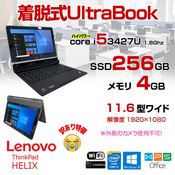 【中古パソコン】Lenovo THINKPAD HELIX 中古 ノート&タブレット 着脱式 ウルトラブック フルHD Win10 Office [Corei5 3427U 1.8GHz 4GB SSD256GB カメラ 11.6型]:アウトレット訳あり品