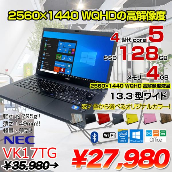 【中古パソコン】NEC VersaProVK17TG-J 選べるカラー 中古ノート Win10 Office 2560x1440 WQHD高画質 [core i5 4210U 1.7GHz 4GB SSD128GB 13.3型 無線 BT]:良品
