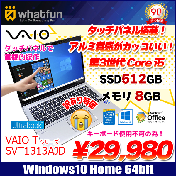 【中古パソコン】SONY VAIO Tシリーズ SVT1313AJD タッチパネル 中古 ノート Office Win10 BTカメラ HDMI [Corei5 3337U 1.8GHz 8G SSD128GB 13.3型]:訳あり
