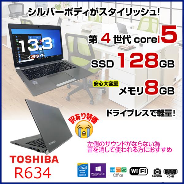【中古パソコン】東芝 R634 中古 ノートパソコン Office Win10 Home 第4世代 モバイル [core i5 4210U 1.7GHz 8GB 高速SSD128GB 無線 13.3型] :訳あり