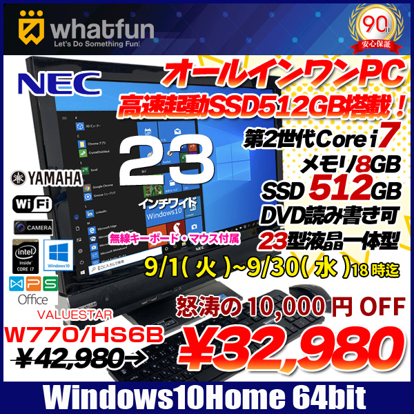 【中古パソコン】NEC VALUSTAR VW770/HS6B 中古 23インチ大画面 一体型デスクトップ Wind10 [corei7 2670QM 2.2GHz メモリ8G SSD512GB DVDマルチ カメラ 無線キー・マウス]