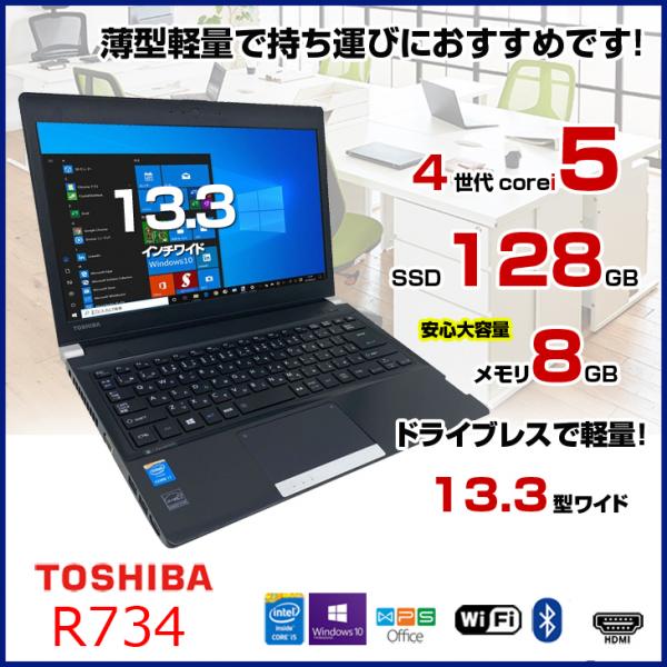【中古パソコン】東芝 R734 中古 ノートパソコン Office Win10 第4世代 [core i5 4300M 2.6GHz 8GB 128GB 無線 13.3型 HDMI] :アウトレット