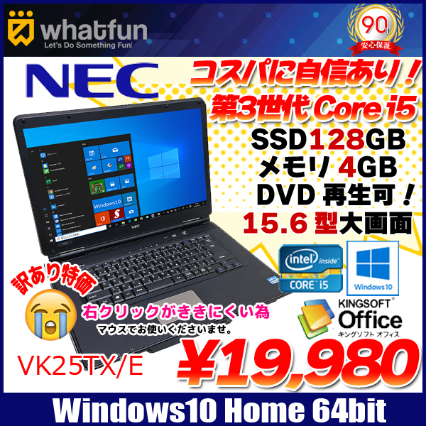 【中古パソコン】NEC VK25TX-E 中古ノートパソコン Win10 Office 第3世代 マウス付 [Corei5 3210M 2.5GHz メモリ4GB SSD128GB ROM HDMI 15.6型] :訳あり