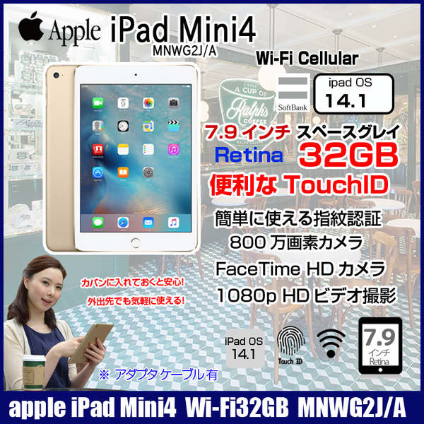 【中古iPad】Apple iPad mini4 MNWG2J/A Softbank Wi-Fi+Cellular 32GB [ A8 32GB(SSD) 7.9インチ iPad OS 14.1 ゴールド ]:良品