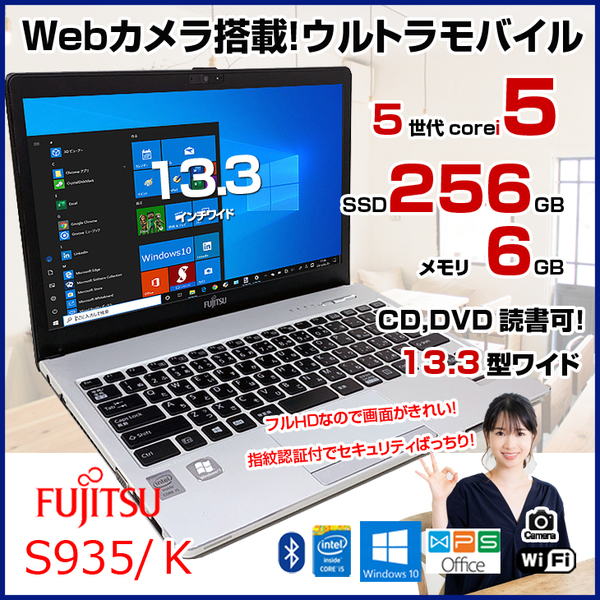 【中古パソコン】富士通 S935/K 中古 ノート Office Win10 フルHD 第5世代 カメラ 指紋 [corei5 5300U 2.3GHz 6GB SSD256GB マルチ 無線 BT 13.3型 ] :良品