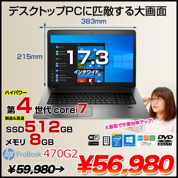 【中古パソコン】テレワーク応援!HP 470G2 中古 ノート Office Win10 テンキー カメラ フルHD 指紋[core i7 4558U 2.8GHz 8GB SSD512GB マルチ 無線 17.3型]:良品