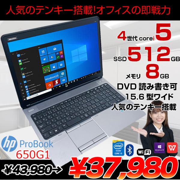 【中古パソコン】HP PROBOOK 650G1 中古 ノート Office Win10 テンキー 無線 指紋 [core i5 4200M 2.5GHz 8GB SSD512GB マルチ 15.6型 ] :良品