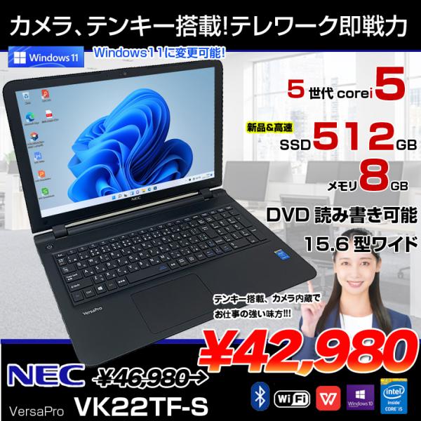 【中古パソコン】NEC VK22TF-S 中古ノート選べる Win11 or Win10 Office 第5世代 カメラ テンキー [Corei5 5200U 2.2GHz メモリ8G SSD512GB マルチ 無線 BT 15.6型 ] :良品