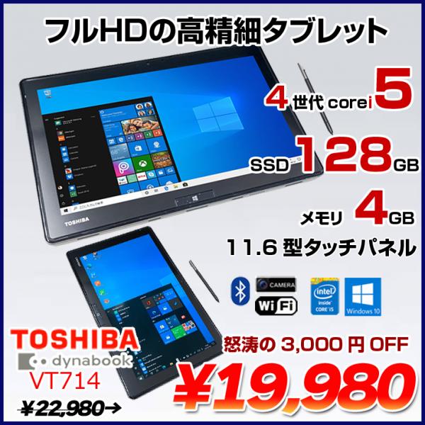 【中古パソコン】東芝 VT714 中古 タブレット Win10 タッチパネル 第四世代 カメラ [core i5 4210Y 1.5GHz 4GB SSD128GB 11.6型 BT ペン付] :良品