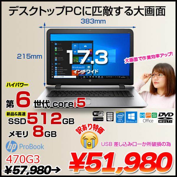 【中古パソコン】HP PROBOOK 470G3 中古 ノート テレワーク Office Win10 第6世代 テンキー カメラ [core i5 6200U 8GB SSD512GB マルチ 無線 BT 17.3型]:訳あり