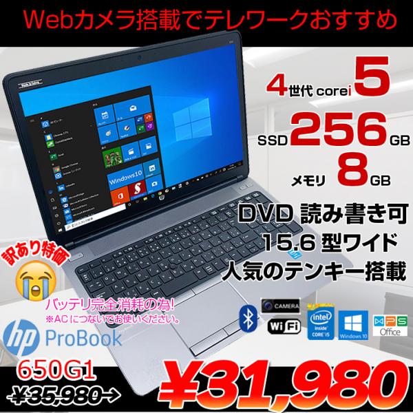 【中古パソコン】HP PROBOOK 650G1 中古 ノート Office Win10 テンキー 無線 BT カメラ 指紋 [core i5 4200M 2.5GHz 8GB SSD256GB マルチ 15.6型 ] :訳あり