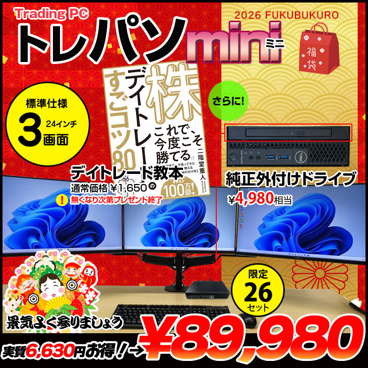 【2026年新春 トレパソミニの福袋】【トレーディングパソコンMini 24インチ液晶×3画面】 FX ビジネスにも 極小PC 3画面マルチモニタ トレパソ3 Mini 24インチ Office Win10 無線キー・マウス ※デイトレード教本付 ※DVDドライブ付 8世代 Core i5 8G SSD500GB] :良品