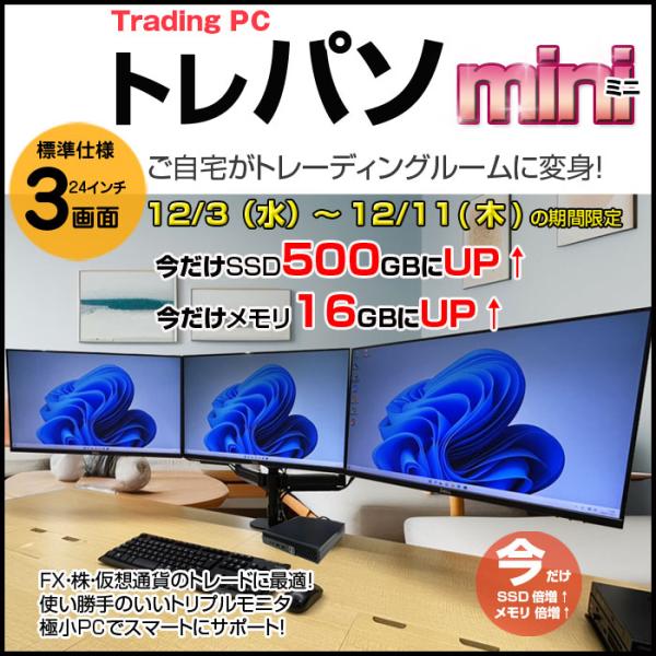 【12/3-12/11までスペック超倍増中↑】【トレーディングパソコンMini 24インチ液晶×3画面】 FX ビジネスにも 極小PC 3画面マルチモニタ トレパソ3 Mini 24インチ Office Win10 無線キー・マウス付 8世代 Core i5 8G SSD500GB] :良品