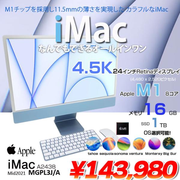 【中古パソコン】Apple iMac 24inch MGPL3J/A A2438 4.5K 2021 一体型 選べるOS Touch ID [Apple M1 8コア メモリ16GB SSD1TB 無線 BT カメラ 24インチ Blue ]:美品