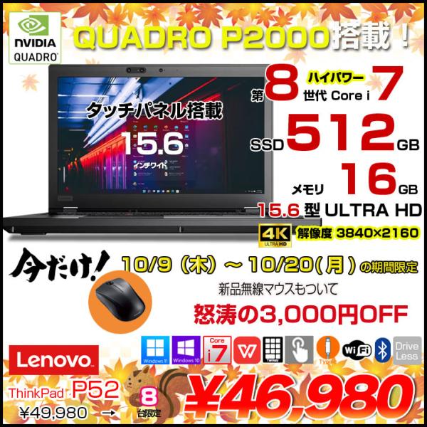 【中古パソコン 10/9-10/20まで期間限定価格+無線マウスプレゼント】Lenovo P52 20MA-S1D400 4K液晶 タッチパネル QuadroP2000搭載 中古 ノート Office Win11 or win10 テンキー カメラ [Core i7 8850H 16GB SSD512GB 無線 15.6]:アウトレット