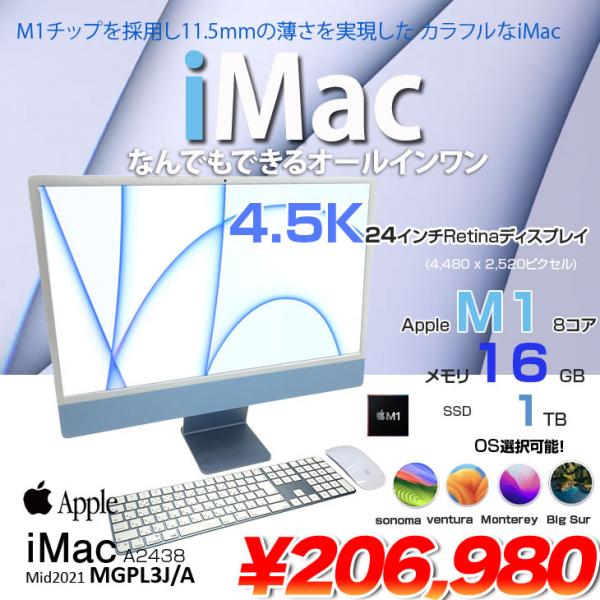 【中古パソコン】Apple iMac 24inch MGPL3J/A A2438 4.5K 2021 一体型 選べるOS Touch ID [Apple M1 8コア メモリ16GB SSD1TB 無線 BT カメラ 24インチ 純箱 Blue ]:美品