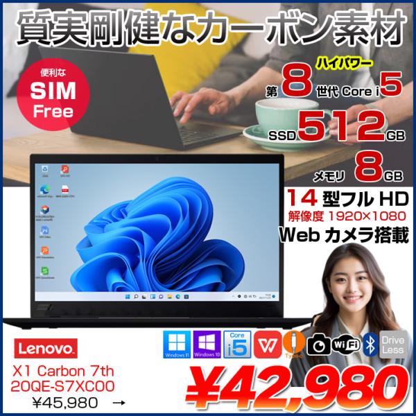 【中古パソコン】Lenovo X1 Carbon 2019 7th 20QE-S7XC00 中古 ノート Office 選べるOS 第8世代 [Core i5 8265U メモリ8GB SSD512GB 無線 SIMフリー カメラ 指紋 14型 ] :良品