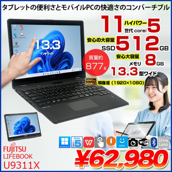 【中古パソコン】富士通 LIFEBOOK U9311X 中古 タッチパネル搭載 ノート タブレットモード Office Win11 第11世代[Core i5 1145G7 メモリ8GB SSD512GB カメラ ペン 13.3]:良品