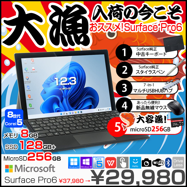 【中古パソコン】Microsoft Surface Pro6 中古 タブレット 選べるカラー Office Win11 便利な7in1USBマルチハブ+新品Bluetoothキー+ペン+マウス[Core i5 8350U 8G 128G カメラ 12.3]:良品