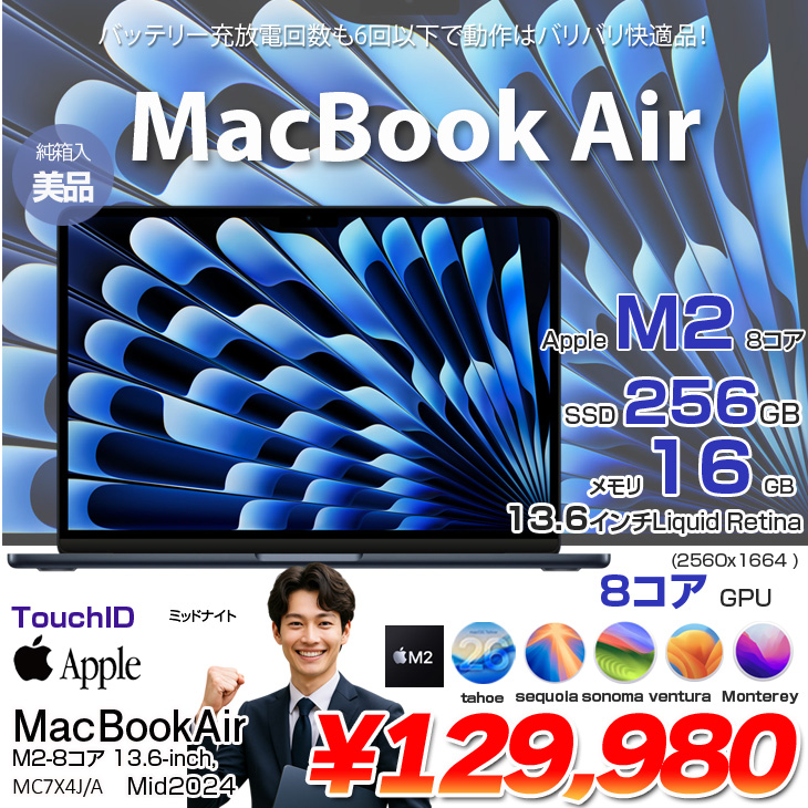 【中古パソコン】Apple MacBook Air 13.6inch MC7X4J/A A2681 2024 TouchID [Apple M2 8コア メモリ16GB SSD256GB 無線 BT カメラ 13.6 Midnight 純箱] :美品